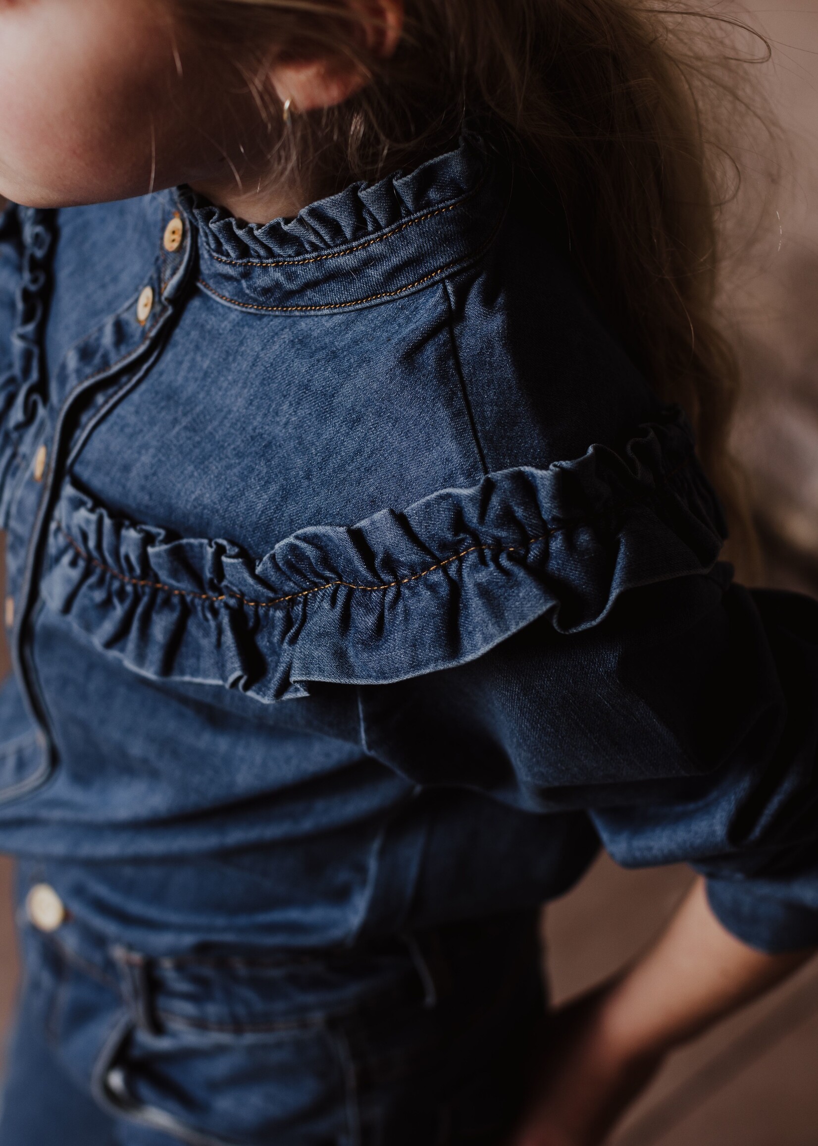 Stoere denim blouse afgewerkt met girly ruffles. Een feestelijk hemdje voor de meisjes. 95% Organisch katoen, 5% EA
